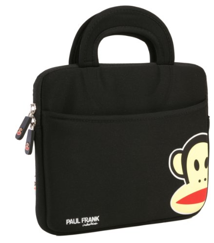 Sacoche noire avec poignées pour Apple iPad / tablette 10 pouces, au thème Paul Frank, (néoprène, imperméable, double fermeture éclair YKK, poche extérieure, doublure intérieure peluche douce)